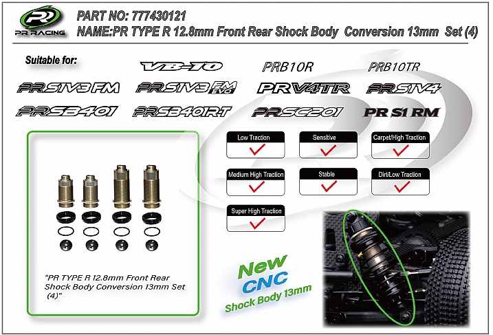 Name:PR TYPE R 12.8mm Front Rear Shock Body Conversion 13mm Set (4)